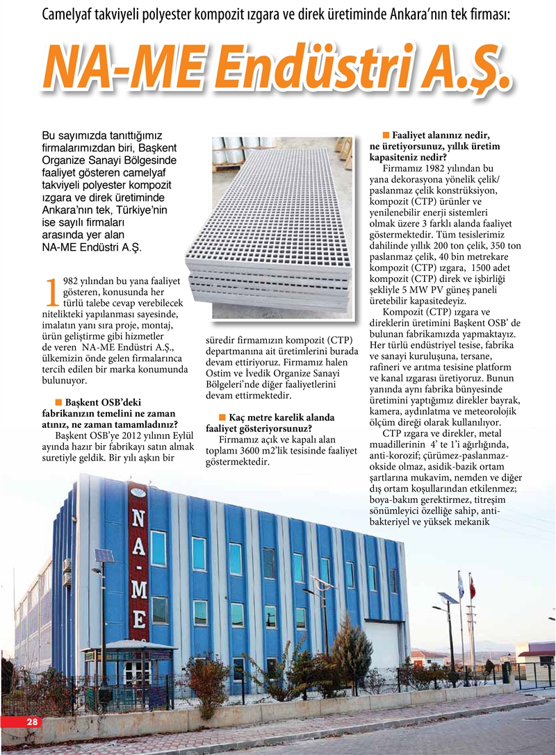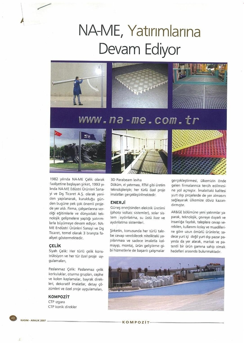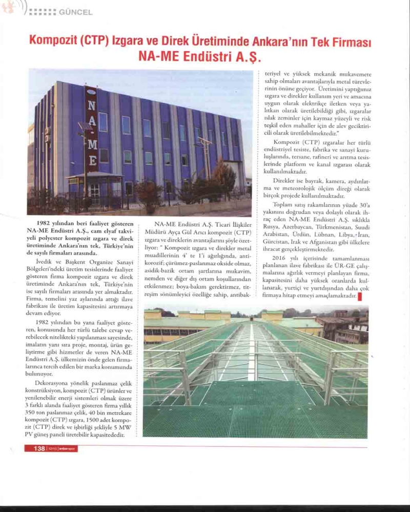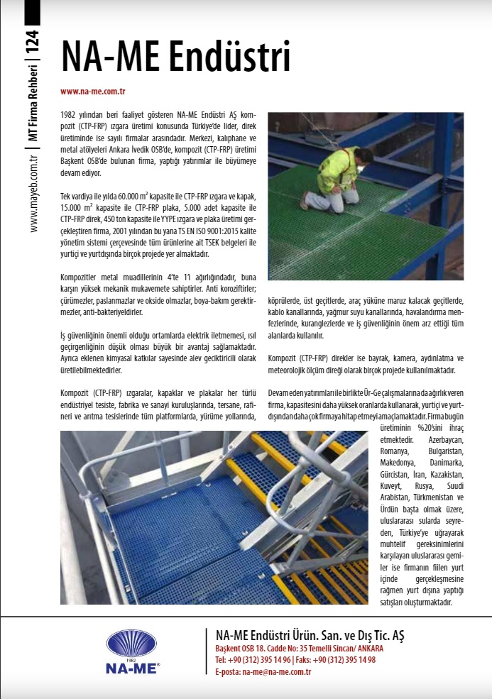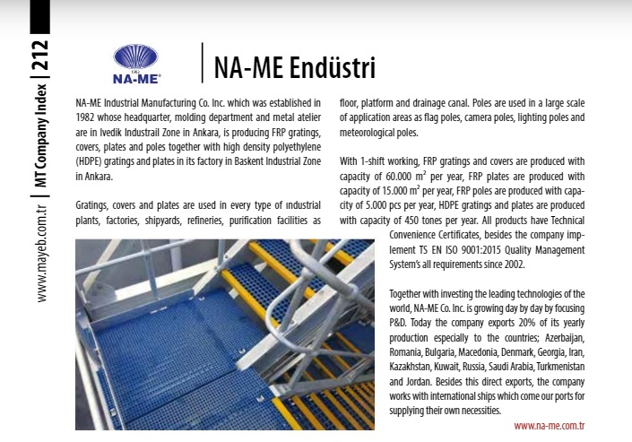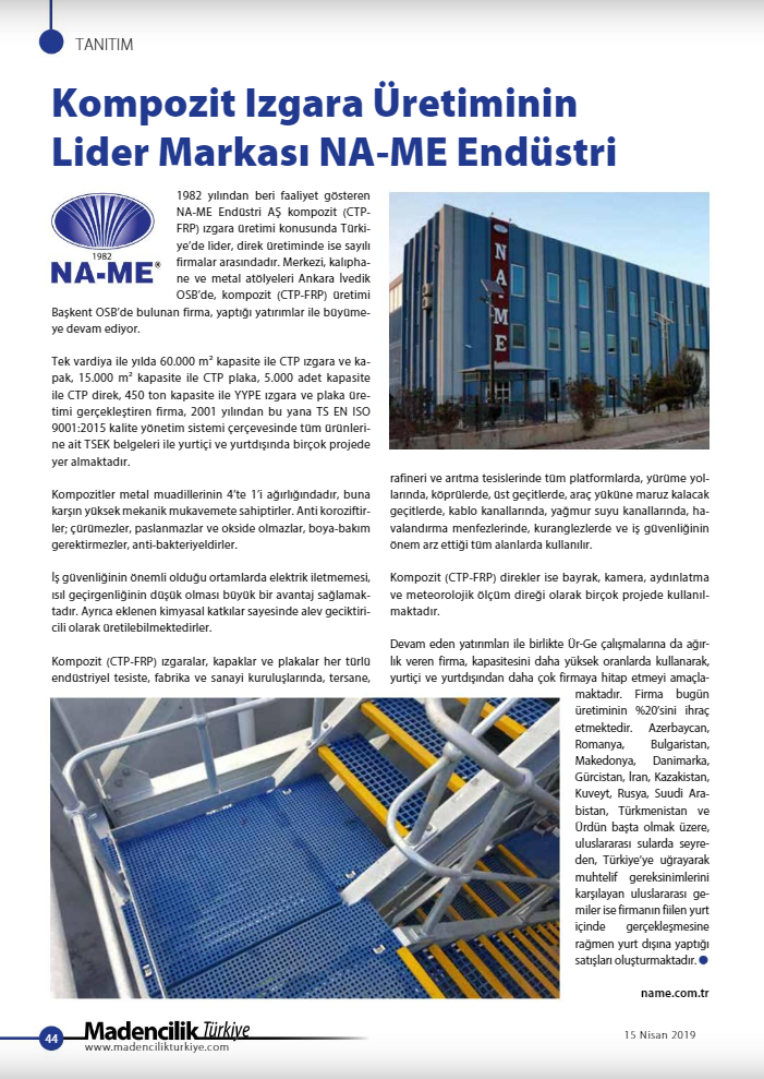 1982 yılından bu yana endüstriyel çözümler üreten NA-ME Endüstri; üretim kalitesi, Ar-Ge çalışmaları ve ihracat başarılarıyla ulusal ve uluslararası basında yer almaya devam ediyor. (CTP-FRP) Kompozit Izgara ve endüstriyel yapı elemanları konusundaki uzmanlığımız, sektörel dergilerin ve sanayi haberlerinin ilgi odağı olmaktadır.