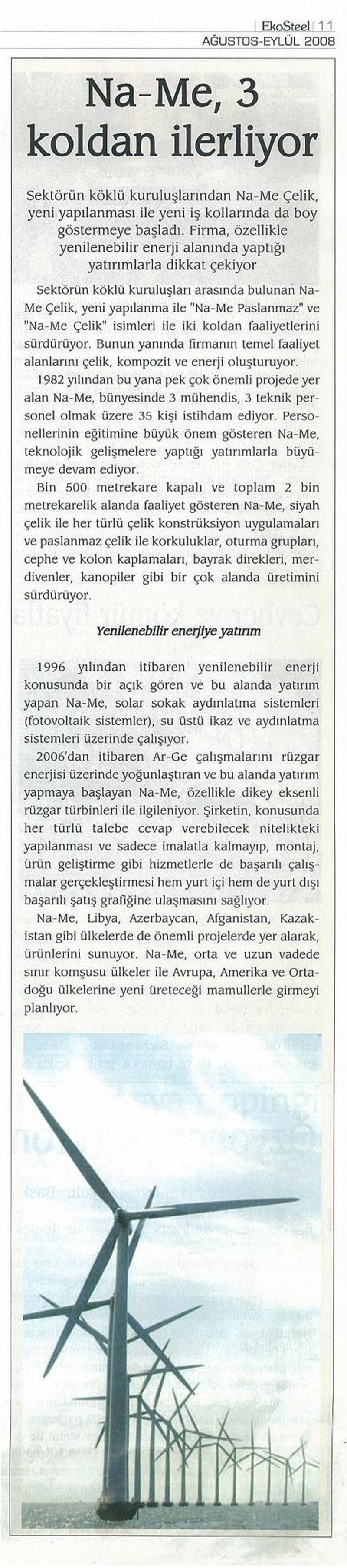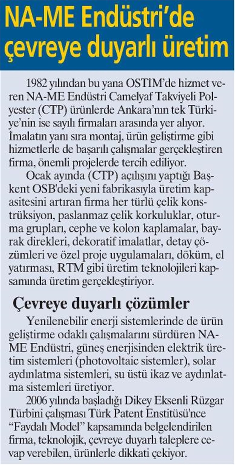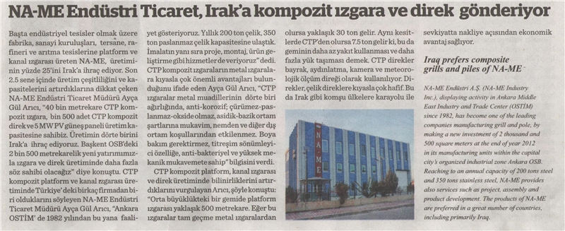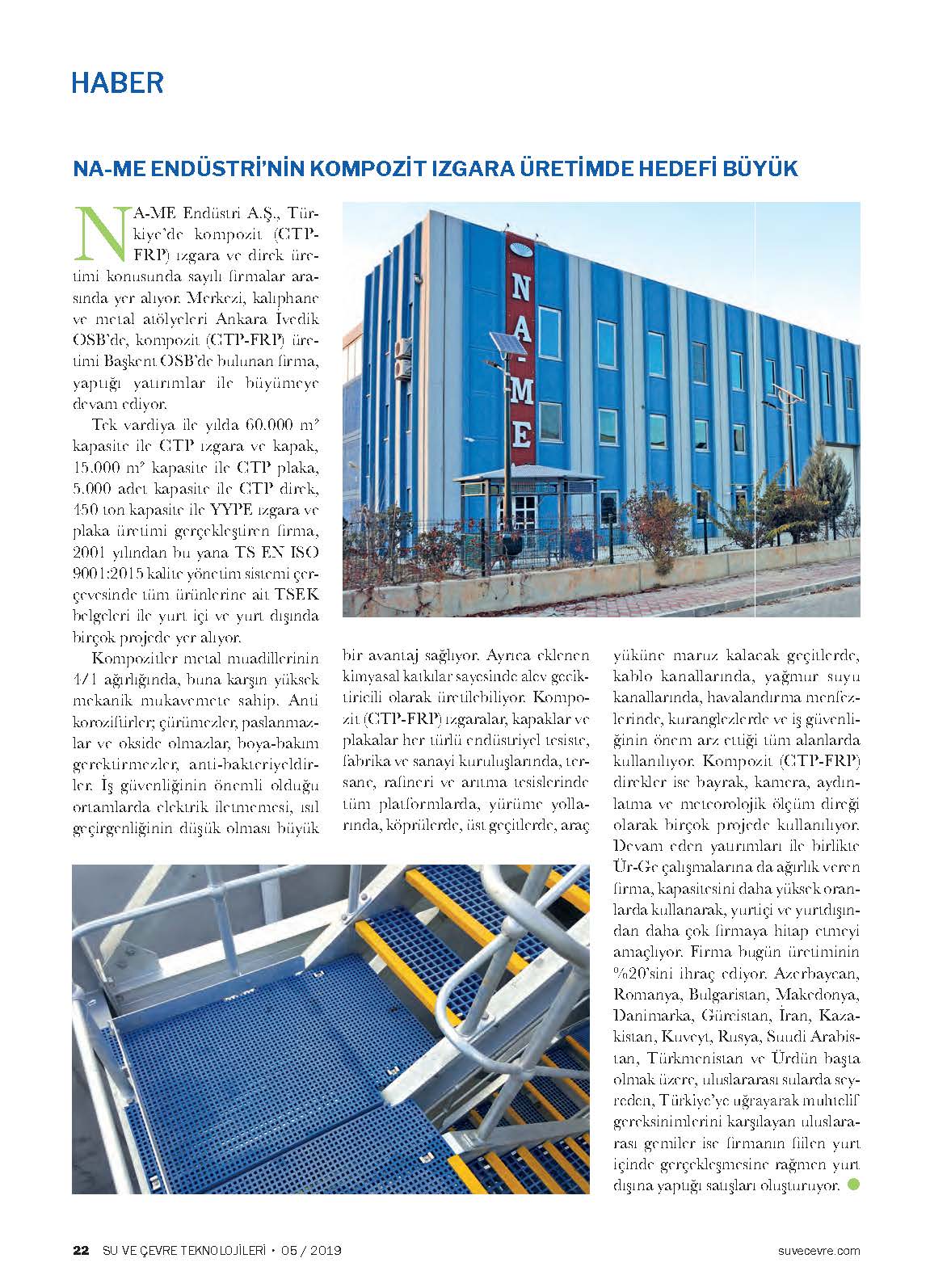 1982 yılından bu yana endüstriyel çözümler üreten NA-ME Endüstri; üretim kalitesi, Ar-Ge çalışmaları ve ihracat başarılarıyla ulusal ve uluslararası basında yer almaya devam ediyor. (CTP-FRP) Kompozit Izgara ve endüstriyel yapı elemanları konusundaki uzmanlığımız, sektörel dergilerin ve sanayi haberlerinin ilgi odağı olmaktadır.